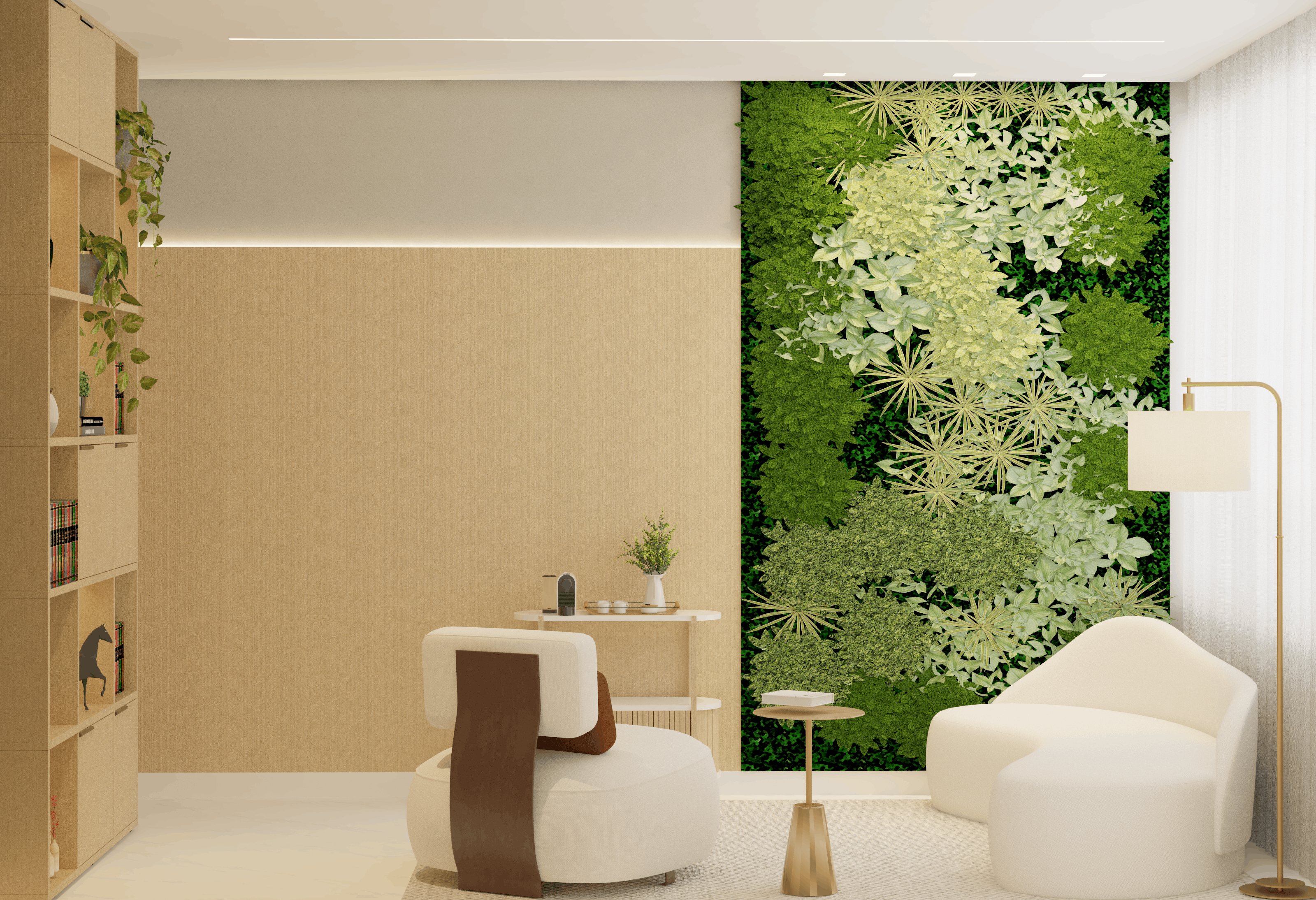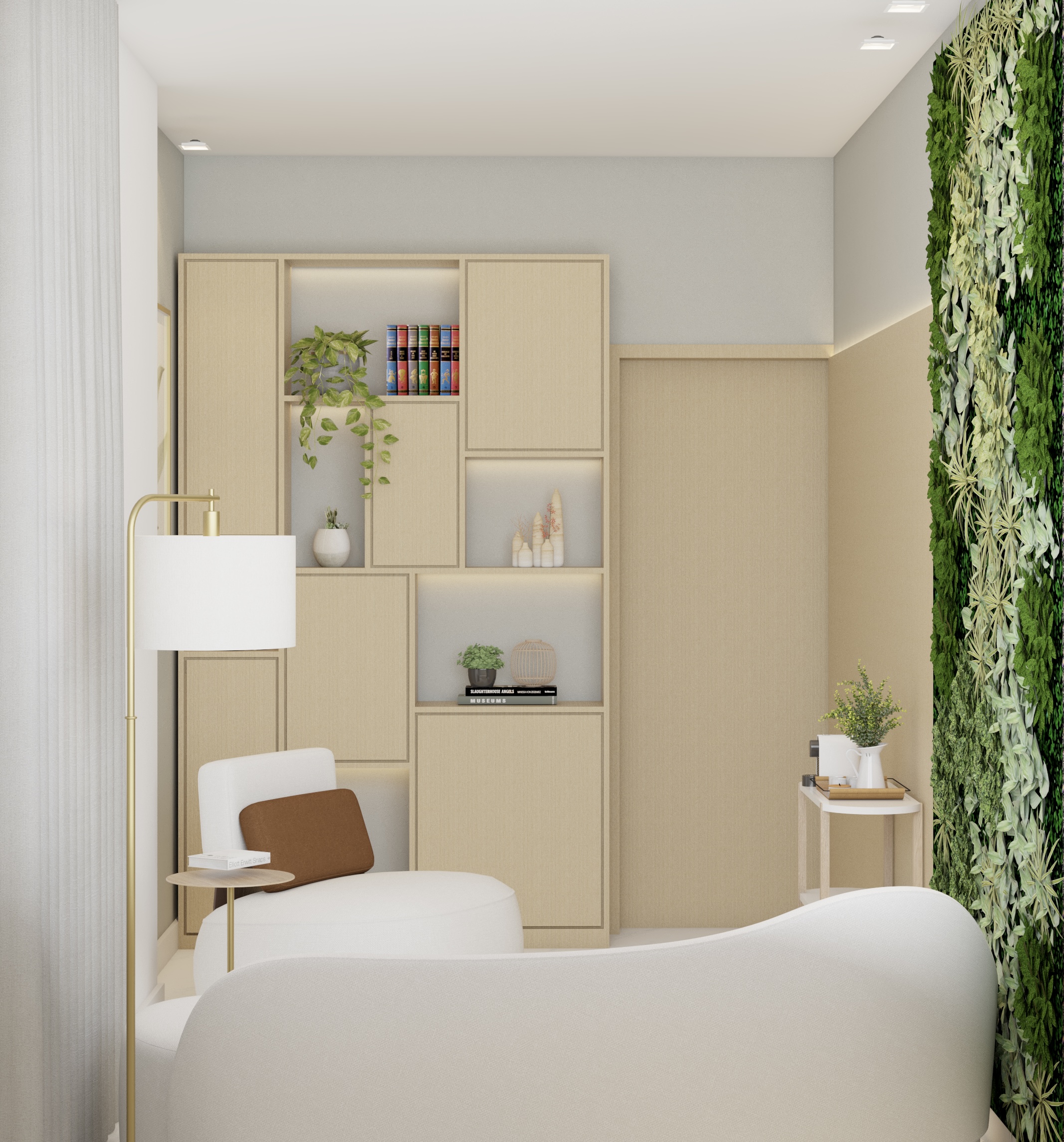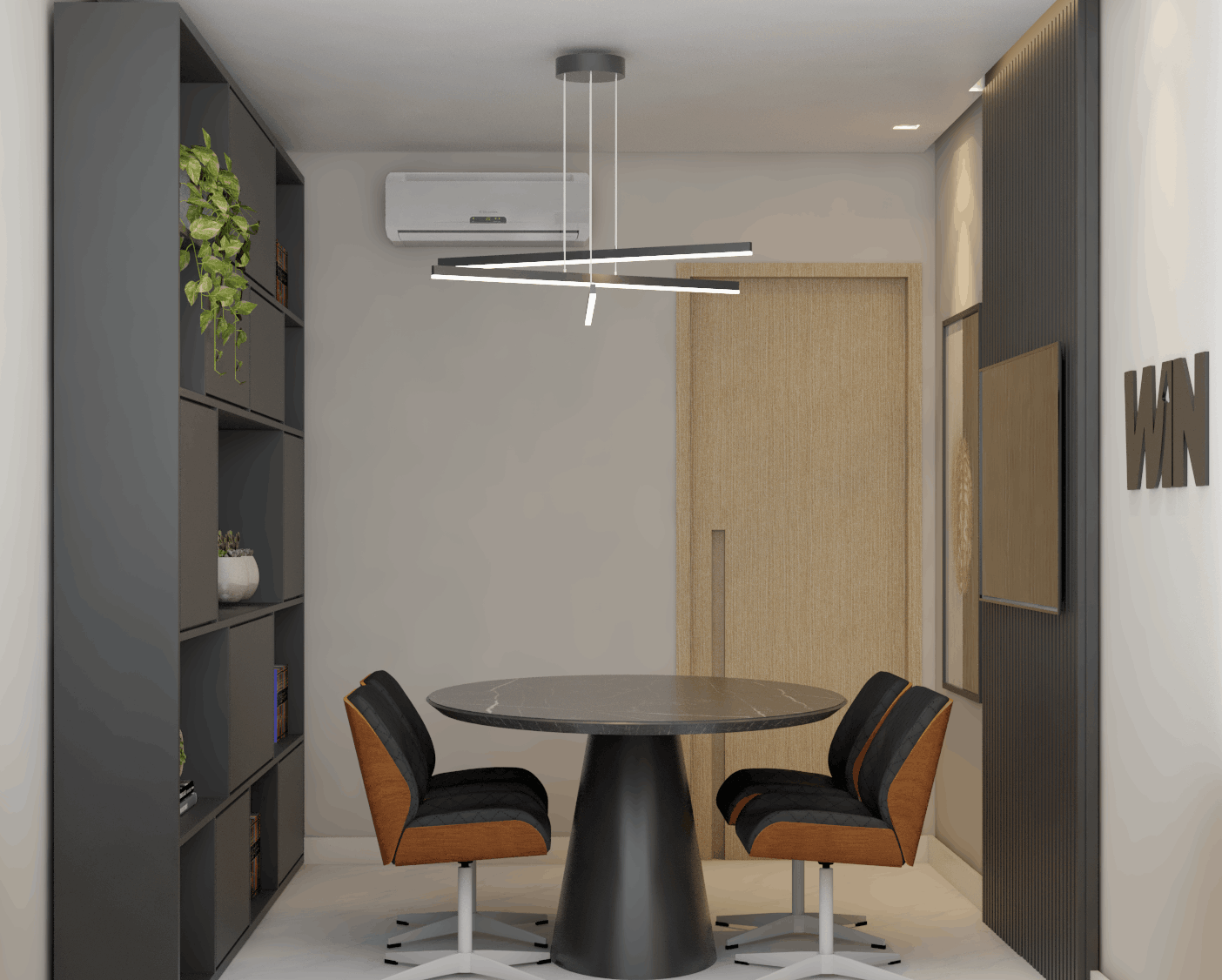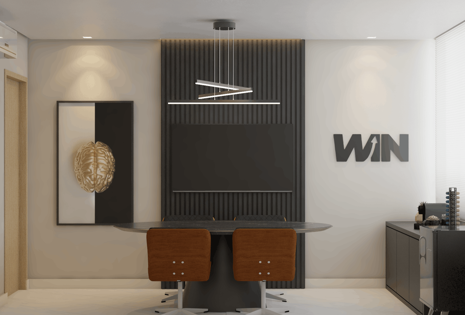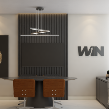 O projeto desenvolvido para o escritório Win de Alphaville/SP, apresenta uma recepção elegante e acolhedora, projetada com um painel ripado em tons de madeira,que integram portas mimetizadas, proporcionando um visual clean e contínuo, iluminação indireta para criar uma atmosfera tranquila e um jardim vertical que traz frescor ao ambiente. O espaço integra funcionalidade e estética, incluindo uma sala de psicanálise e uma sala de reuniões, pensadas para proporcionar conforto e sofisticação em todas as áreas.