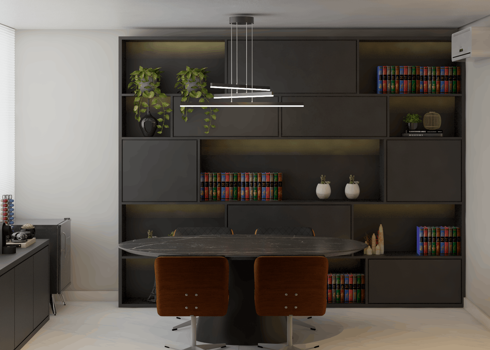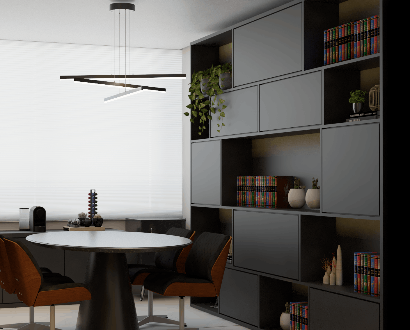 Desenvolvido para atender clientes de forma personalizada, este escritório une funcionalidade e acolhimento. O design prioriza a integração entre as áreas, com mobiliário confortável e uma atmosfera elegante e convidativa. Os tons neutros e o uso estratégico de elementos decorativos criam um ambiente ideal para negociações e atendimento em um espaço moderno e tranquilo.